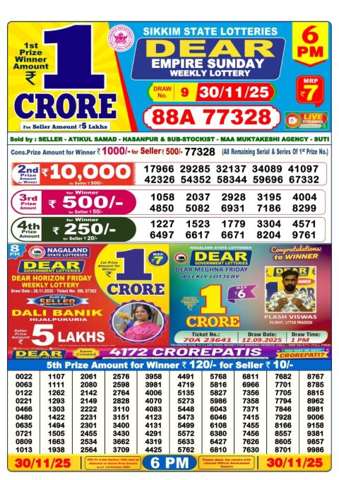 Dear Lottery Sambad 6 PM Result [November 30, 2025] | Latest 6pm Lottery Live