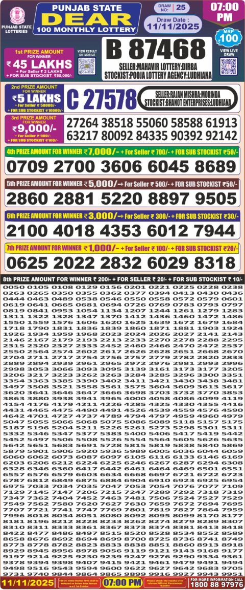 Punjab State Dear 100 Monthly [November 11, 2025]| Today Official Lottery Result