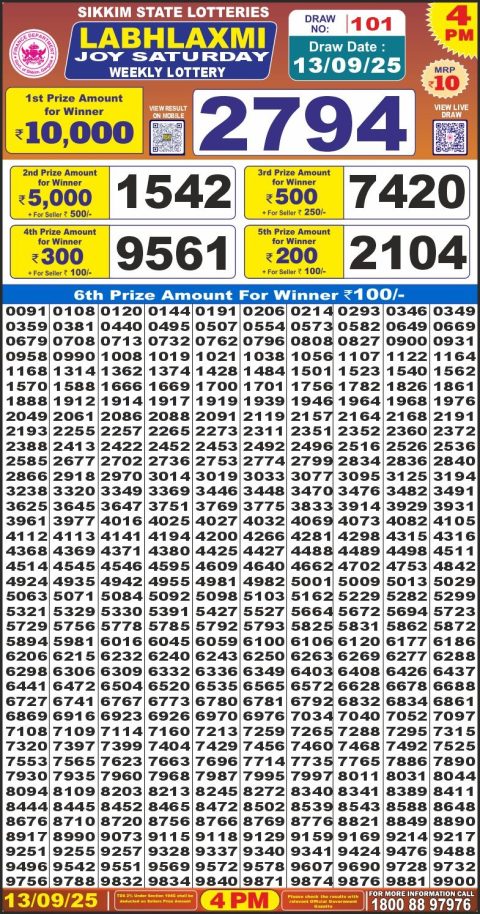 Labh Laxmi 4 PM Result Today [September 13, 2025] | Official Lottery Result