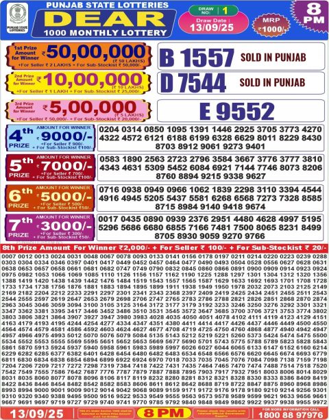 Punjab State Dear 1000 Monthly Lottert 8PM Result [September 13, 2025]
