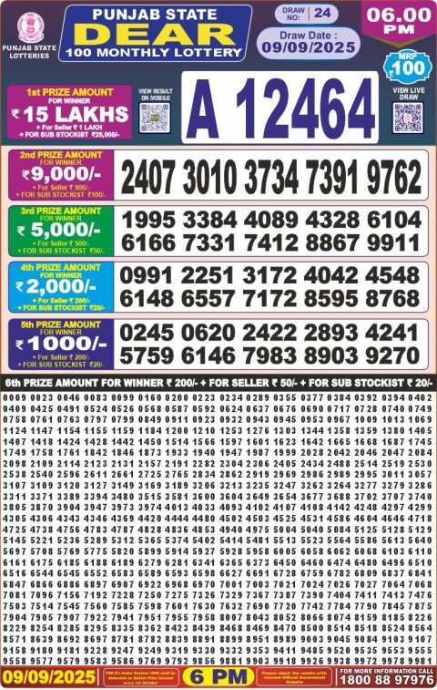 Punjab State Dear 100 Monthly Lottery 6PM Result [September 09, 2025] |