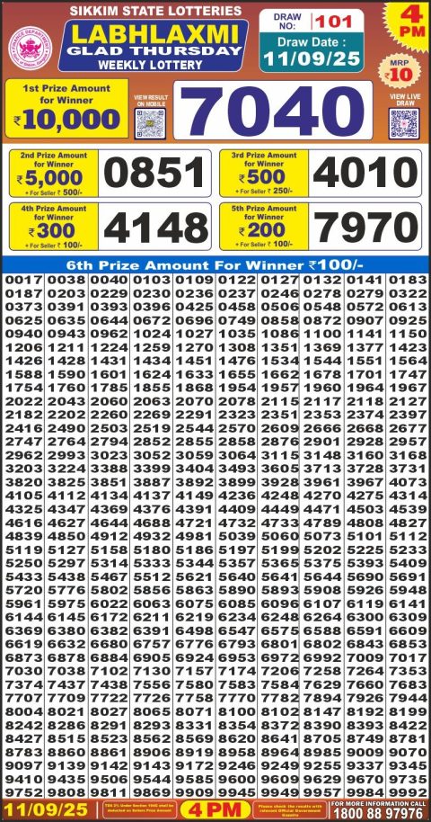 Labh Laxmi 4 PM Result Today [September 11, 2025] | Official Lottery Result