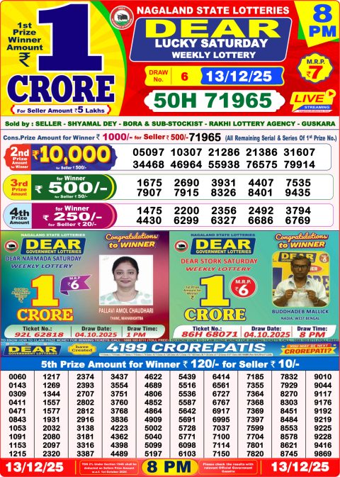 Dear Lottery Sambad 6 PM Result [December 13, 2025] | Latest 6pm Lottery Live