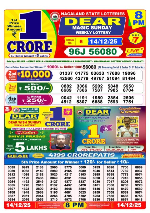 Dear Lottery Sambad 6 PM Result [December 14, 2025] | Latest 6pm Lottery Live
