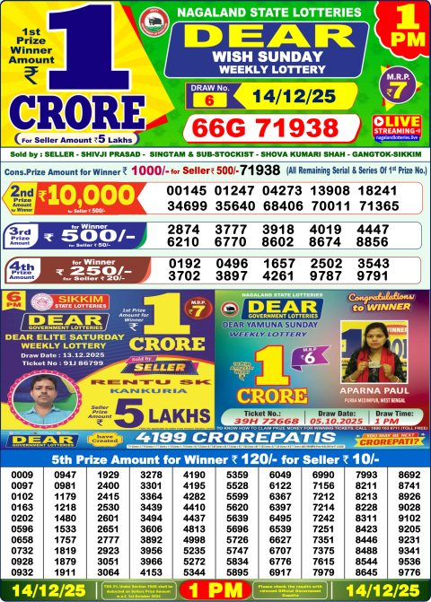Lottery Sambad Result 1 PM Today [December 14, 2025] | Dear Lottery Daily Draw