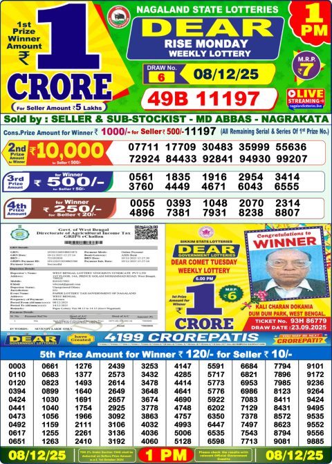 Lottery Sambad Result 1 PM Today [December 8, 2025] | Dear Lottery Daily Draw