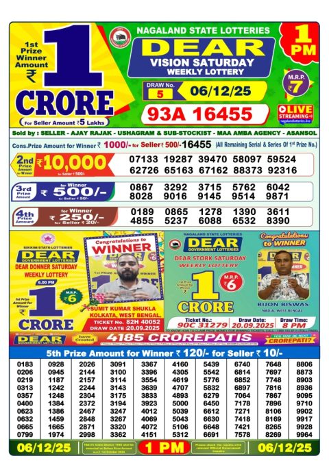 Lottery Sambad Result 1 PM Today [December 6, 2025] | Dear Lottery Daily Draw